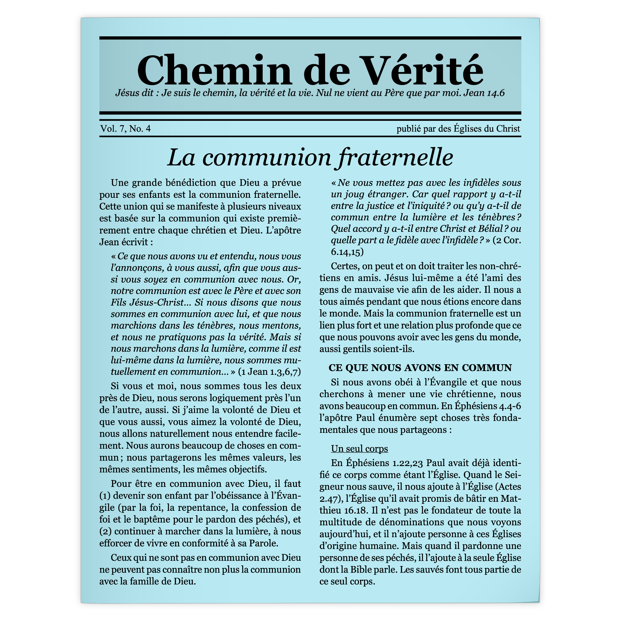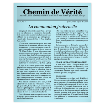 Une grande bénédiction que Dieu a prévue pour ses enfants est la communion fraternelle. Cette union qui se manifeste à plusieurs niveaux est basée sur la communion qui existe premièrement entre chaque chrétien et Dieu. L’apôtre Jean écrivit :