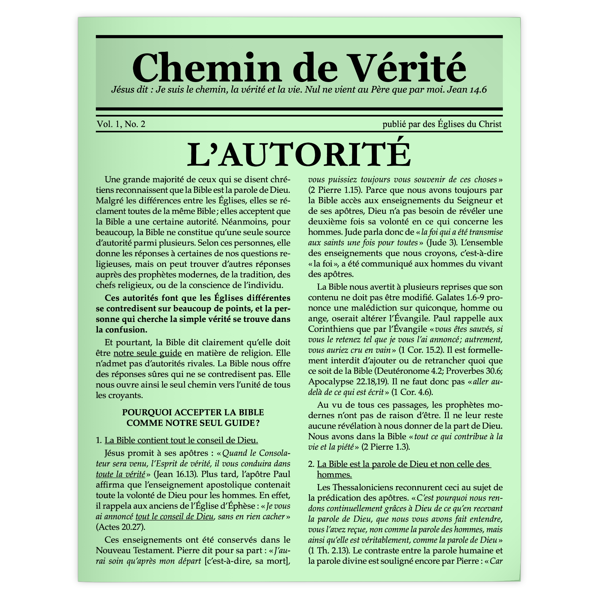 Une grande majorité de ceux qui se disent chrétiens reconnaissent que la Bible est la parole de Dieu. Malgré les différences entre les Églises, elles se réclament toutes de la même Bible ; elles acceptent que la Bible a une certaine autorité. Néanmoins, pour beaucoup, la Bible ne constitue qu’une seule source d’autorité parmi plusieurs. Selon ces personnes, elle donne les réponses à certaines de nos questions religieuses, mais on peut trouver d’autres réponses auprès des prophètes modernes, de la tradition, des chefs religieux, ou de la conscience de l’individu.