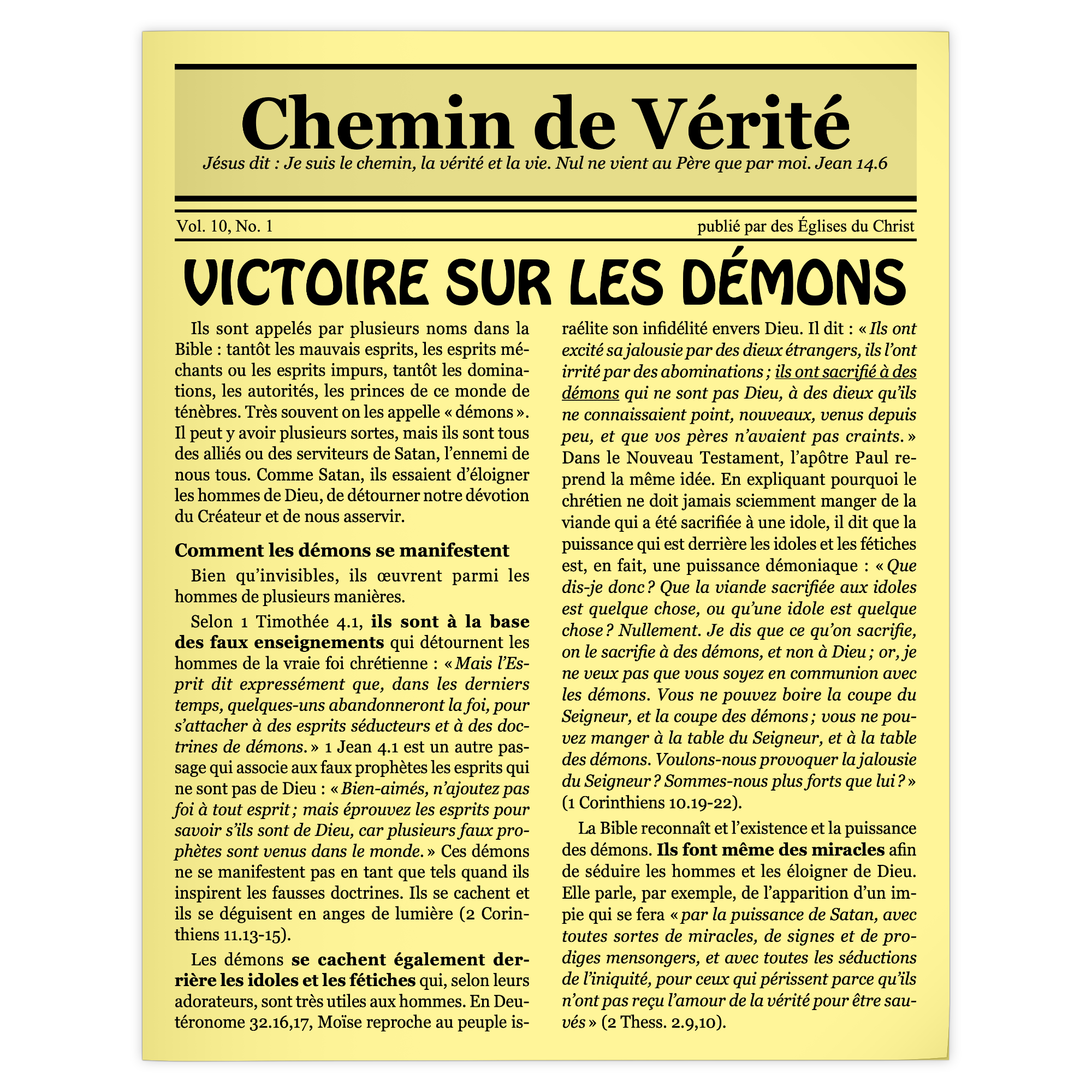Selon 1 Timothée 4.1, ils sont à la base des faux enseignements qui détournent les hommes de la vraie foi chrétienne : « Mais l’Esprit dit expressément que, dans les derniers temps, quelques-uns abandonneront la foi, pour s’attacher à des esprits séducteurs et à des doctrines de démons. » 1 Jean 4.1 est un autre passage qui associe aux faux prophètes les esprits qui ne sont pas de Dieu : « Bien-aimés, n’ajoutez pas foi à tout esprit ; mais éprouvez les esprits pour savoir s’ils sont de Dieu, car plusieurs faux prophètes sont venus dans le monde. » […]