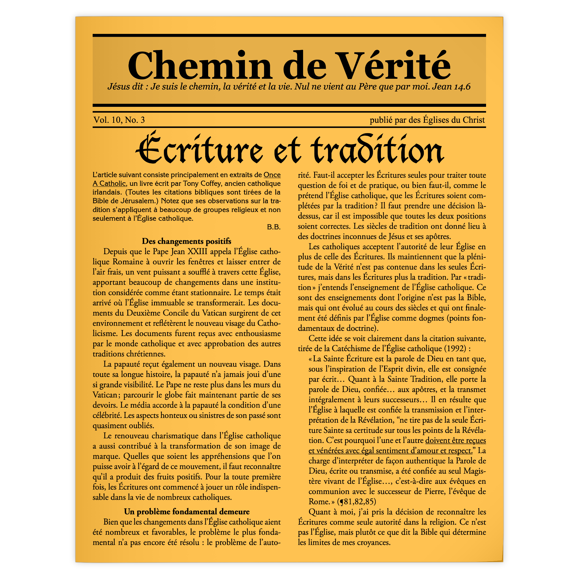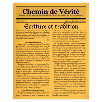 While welcoming the positive changes within the Catholic church, the author explains that a fundamental problem still remains: it is the Scriptures and not the Tradition of the Church that we must recognize as our authority in religion. That is the attitude that Jesus himself showed.