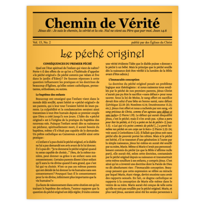 Beaucoup ont enseigné que l’enfant vient dans le monde déjà souillé, ayant hérité ce « péché originel » de ses parents, qui à leur tour l’avaient hérité de leurs parents. La culpabilité et la condamnation seraient ainsi transmises à tout être humain depuis ce premier couple que Dieu a créé jusqu’à nos jours. L’idée du « péché originel » est à l’origine de la pratique du baptême des nouveau-nés. Puisque l’enfant serait dès sa naissance un pécheur, spirituellement mort, il aurait besoin du baptême, même s’il n’était pas capable de le demander. […]