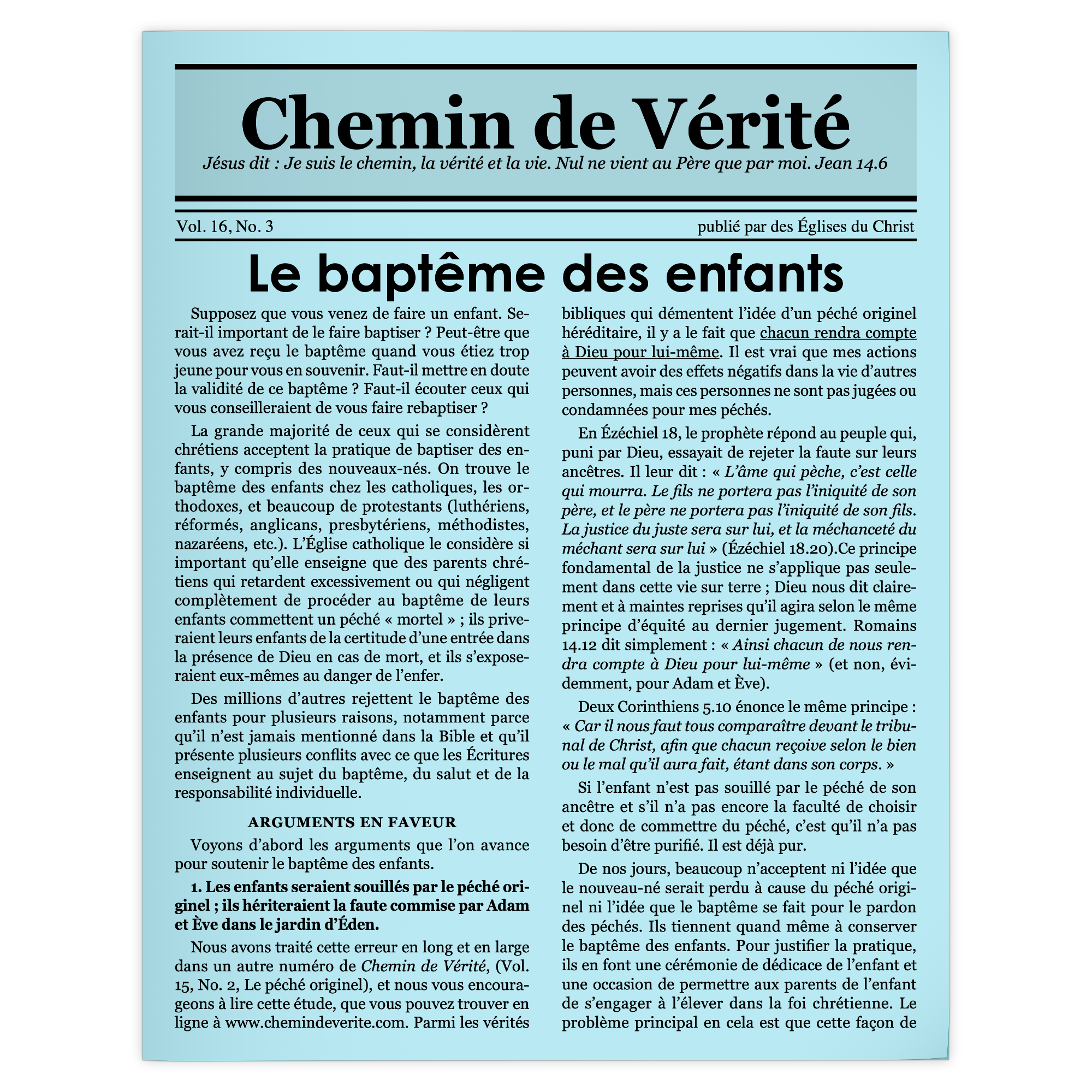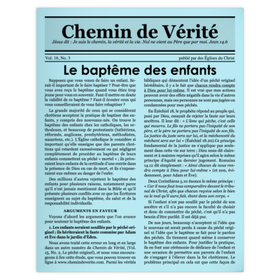 La grande majorité de ceux qui se considèrent chrétiens acceptent la pratique de baptiser des enfants, y compris des nouveaux-nés. On trouve le baptême des enfants chez les catholiques, les orthodoxes, et beaucoup de protestants (luthériens, réformés, anglicans, presbytériens, méthodistes, nazaréens, etc.). L’Église catholique le considère si important qu’elle enseigne que des parents chrétiens qui retardent excessivement ou qui négligent complètement de procéder au baptême de leurs enfants commettent un péché « mortel » ; ils priveraient leurs enfants de la certitude d’une entrée dans la présence de Dieu en cas de mort, et ils s’exposeraient eux-mêmes au danger de l’enfer. […]