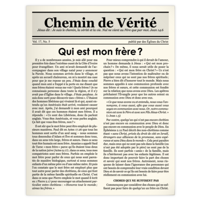 Il y a de nombreuses années, je suis allé pour ma première fois dans l’extrême ouest de la Côte d’Ivoire pour évangéliser. Un ami m’avait demandé de l’accompagner dans son village natal pour y annoncer la Parole. Nous sommes arrivés dans le village, et après un accueil chaleureux, on m’a montré ma case pour que je me repose un peu. J’étais donc couché quand mon ami a frappé à la porte en me disant que mes frères étaient venus me voir ! Quels frères ? Je ne connaissais personne dans toute la région, et il n’y avait pas d’Église dans le village. J’étais perplexe. Je suis donc sorti pour découvrir mes « frères ». C’étaient des hommes libériens qui vivaient là et qui, ayant entendu qu’un Américain était arrivé, voulaient causer avec moi. Après, j’ai demandé à mon ami pourquoi il avait dit que ces hommes étaient mes frères. Il a répondu : « Ce sont des Libériens, donc ils parlent anglais. […]