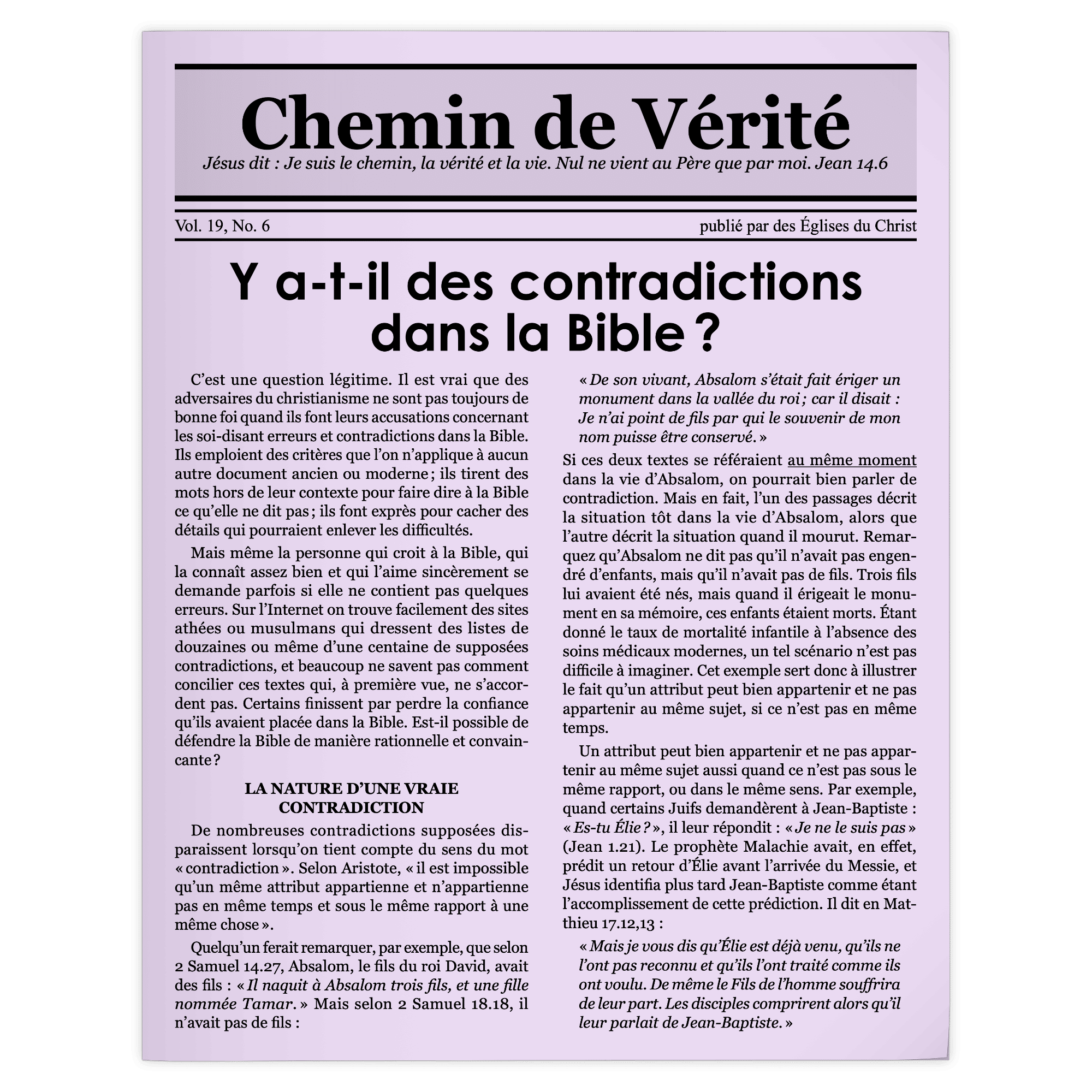 Mais même la personne qui croit à la Bible, qui la connaît assez bien et qui l’aime sincèrement se demande parfois si elle ne contient pas quelques erreurs. Sur l’Internet on trouve facilement des sites athées ou musulmans qui dressent des listes de douzaines ou même d’une centaine de supposées contradictions, et beaucoup ne savent pas comment concilier ces textes qui, à première vue, ne s’accordent pas. Certains finissent par perdre la confiance qu’ils avaient placée dans la Bible. […]
