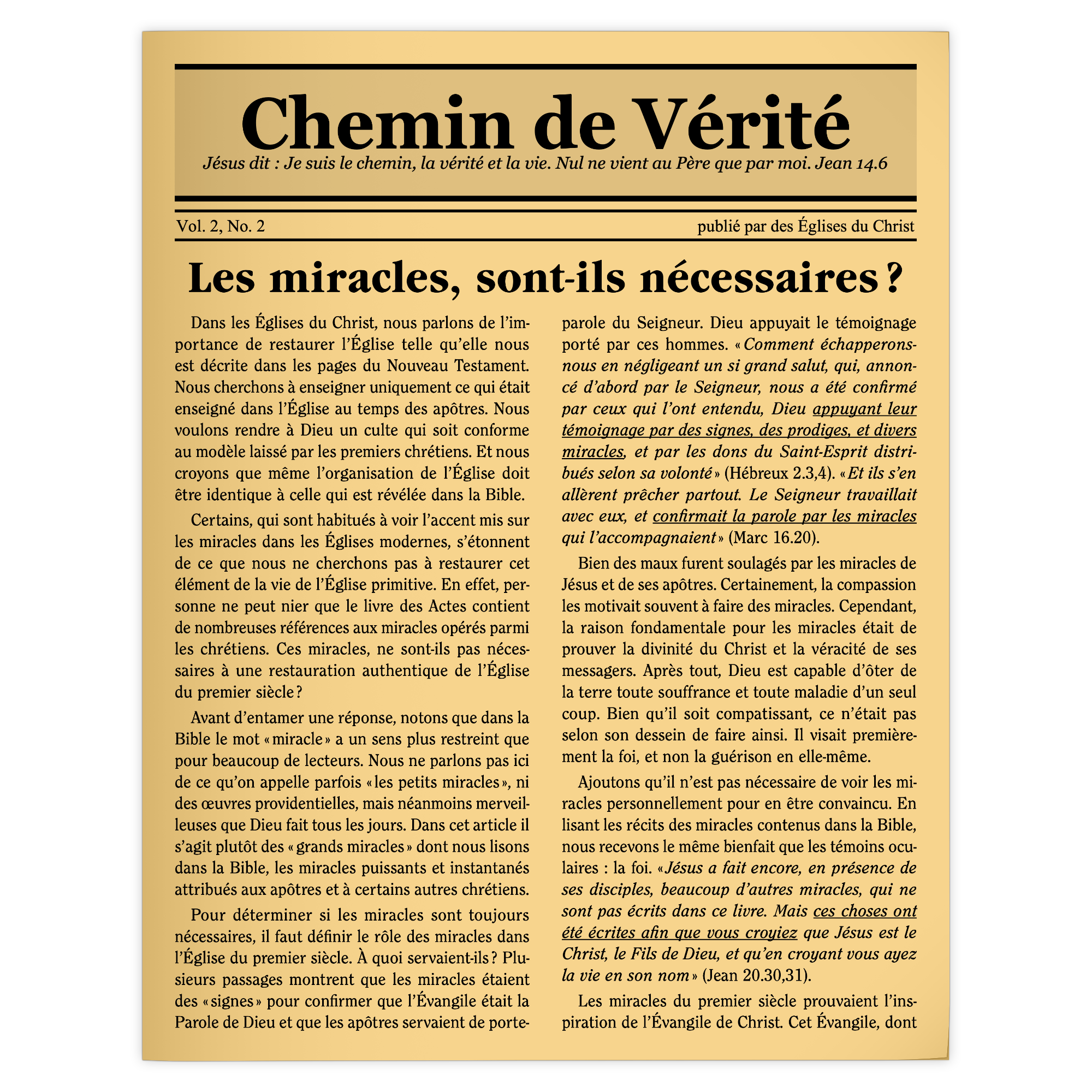 Certains, qui sont habitués à voir l’accent mis sur les miracles dans les Églises modernes, s’étonnent de ce que nous ne cherchons pas à restaurer cet élément de la vie de l’Église primitive. En effet, personne ne peut nier que le livre des Actes contient de nombreuses références aux miracles opérés parmi les chrétiens. Ces miracles, ne sont-ils pas nécessaires à une restauration authentique de l’Église du premier siècle ?