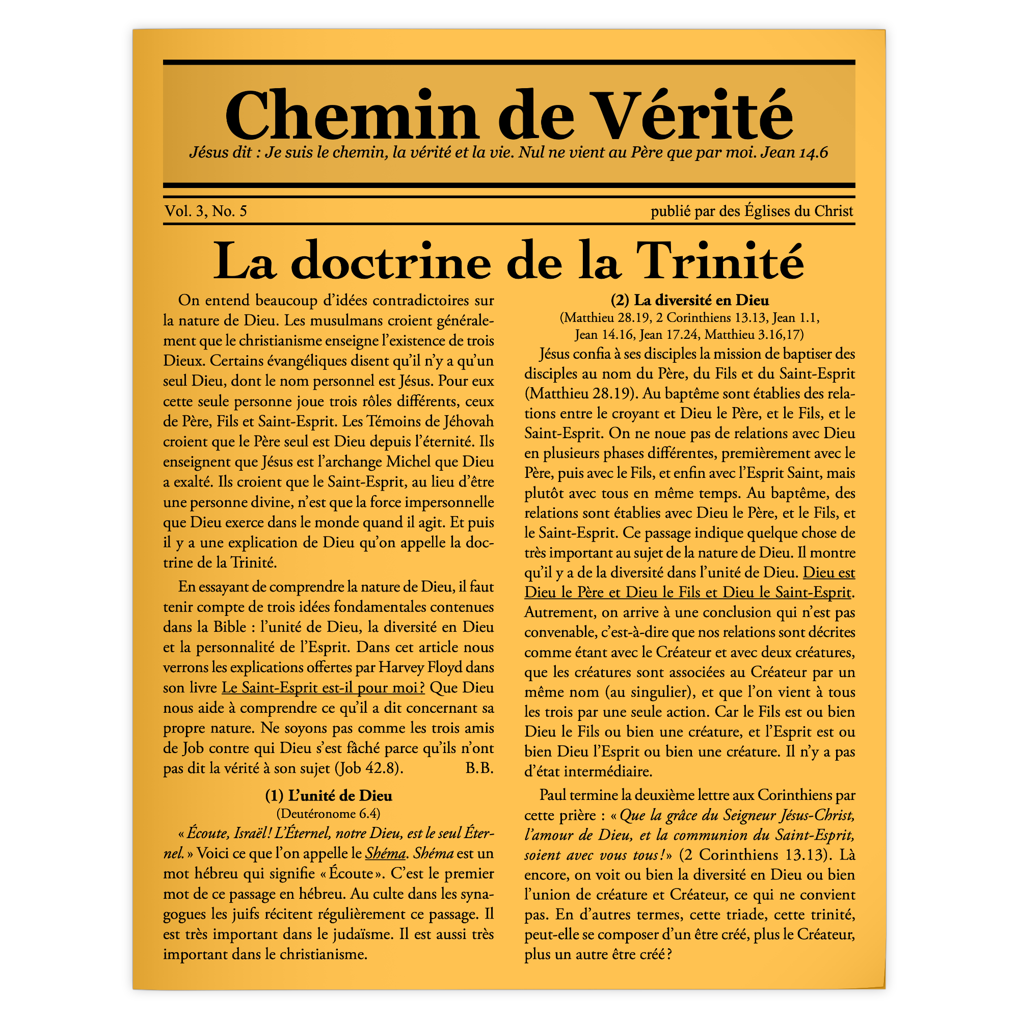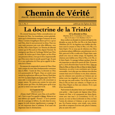 On entend beaucoup d’idées contradictoires sur la nature de Dieu. Les musulmans croient généralement que le christianisme enseigne l’existence de trois Dieux. Certains évangéliques disent qu’il n’y a qu’un seul Dieu, dont le nom personnel est Jésus. Pour eux cette seule personne joue trois rôles différents, ceux de Père, Fils et Saint-Esprit. Les Témoins de Jéhovah croient que le Père seul est Dieu depuis l’éternité. Ils enseignent que Jésus est l’archange Michel que Dieu a exalté. Ils croient que le Saint-Esprit, au lieu d’être une personne divine, n’est que la force impersonnelle que Dieu exerce dans le monde quand il agit. Et puis il y a une explication de Dieu qu’on appelle la doctrine de la Trinité.