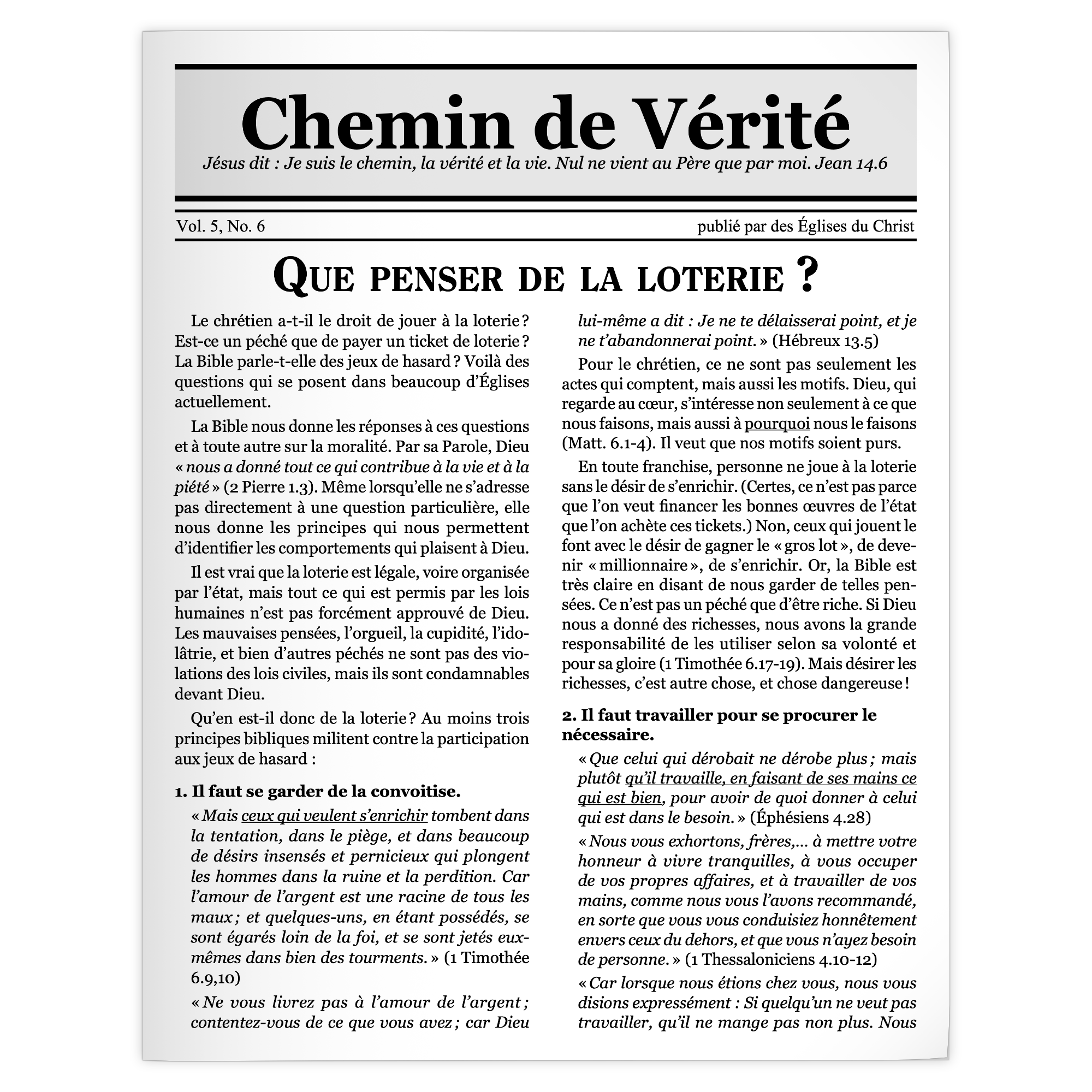 Il est vrai que la loterie est légale, voire organisée par l’état, mais tout ce qui est permis par les lois humaines n’est pas forcément approuvé de Dieu. Les mauvaises pensées, l’orgueil, la cupidité, l’idolâtrie, et bien d’autres péchés ne sont pas des violations des lois civiles, mais ils sont condamnables devant Dieu. […]
