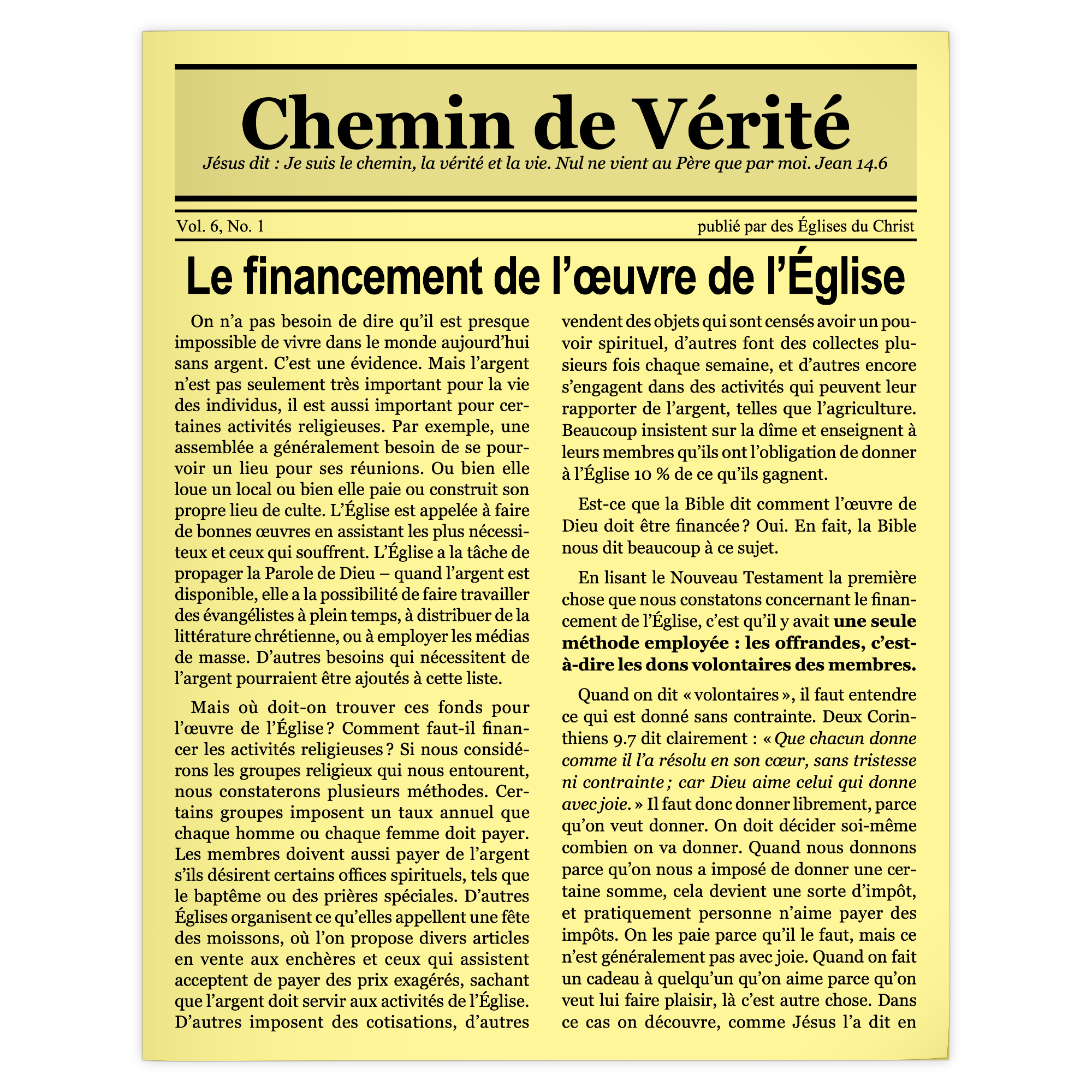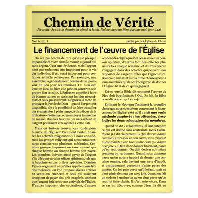 On n’a pas besoin de dire qu’il est presque impossible de vivre dans le monde aujourd’hui sans argent. C’est une évidence. Mais l’argent n’est pas seulement très important pour la vie des individus, il est aussi important pour certaines activités religieuses. Par exemple, une assemblée a généralement besoin de se pourvoir un lieu pour ses réunions. Ou bien elle loue un local ou bien elle paie ou construit son propre lieu de culte. L’Église est appelée à faire de bonnes œuvres en assistant les plus nécessiteux et ceux qui souffrent. L’Église a la tâche de propager la Parole de Dieu – quand l’argent est disponible, elle a la possibilité de faire travailler des évangélistes à plein temps, à distribuer de la littérature chrétienne, ou à employer les médias de masse. D’autres besoins qui nécessitent de l’argent pourraient être ajoutés à cette liste.