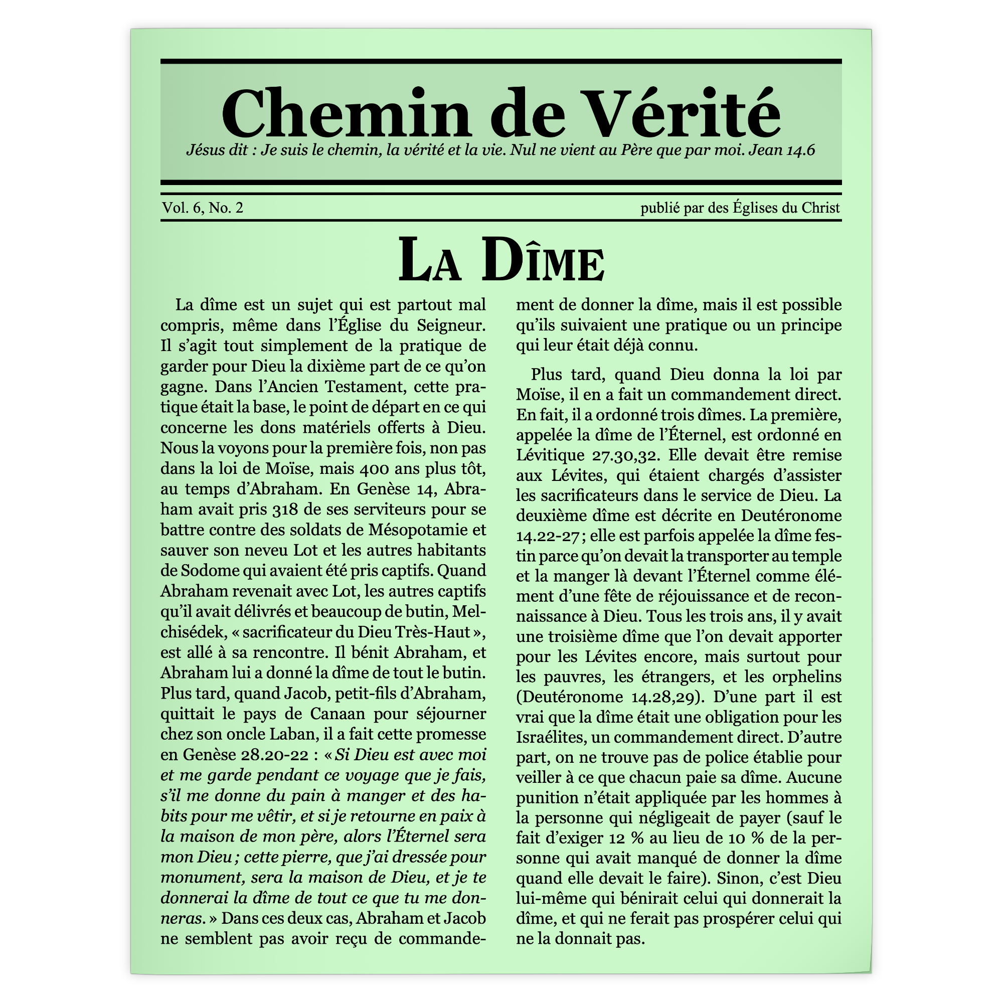 La dîme est un sujet qui est partout mal compris, même dans l’Église du Seigneur. Il s’agit tout simplement de la pratique de garder pour Dieu la dixième part de ce qu’on gagne. Dans l’Ancien Testament, cette pratique était la base, le point de départ en ce qui concerne les dons matériels offerts à Dieu. Nous la voyons pour la première fois, non pas dans la loi de Moïse, mais 400 ans plus tôt, au temps d’Abraham. En Genèse 14, Abraham avait pris 318 de ses serviteurs pour se battre contre des soldats de Mésopotamie et sauver son neveu Lot et les autres habitants de Sodome qui avaient été pris captifs. Quand Abraham revenait avec Lot, les autres captifs qu’il avait délivrés et beaucoup de butin, Melchisédek, « sacrificateur du Dieu Très-Haut », est allé à sa rencontre. Il bénit Abraham, et Abraham lui a donné la dîme de tout le butin. Plus tard, quand Jacob, petit-fils d’Abraham, quittait le pays de Canaan pour séjourner chez son oncle Laban, il a fait cette promesse en Genèse 28.20-22 : « Si Dieu est avec moi et me garde pendant ce voyage que je fais, s’il me donne du pain à manger et des habits pour me vêtir, et si je retourne en paix à la maison de mon père, alors l’Éternel sera mon Dieu ; cette pierre, que j’ai dressée pour monument, sera la maison de Dieu, et je te donnerai la dîme de tout ce que tu me donneras. […]