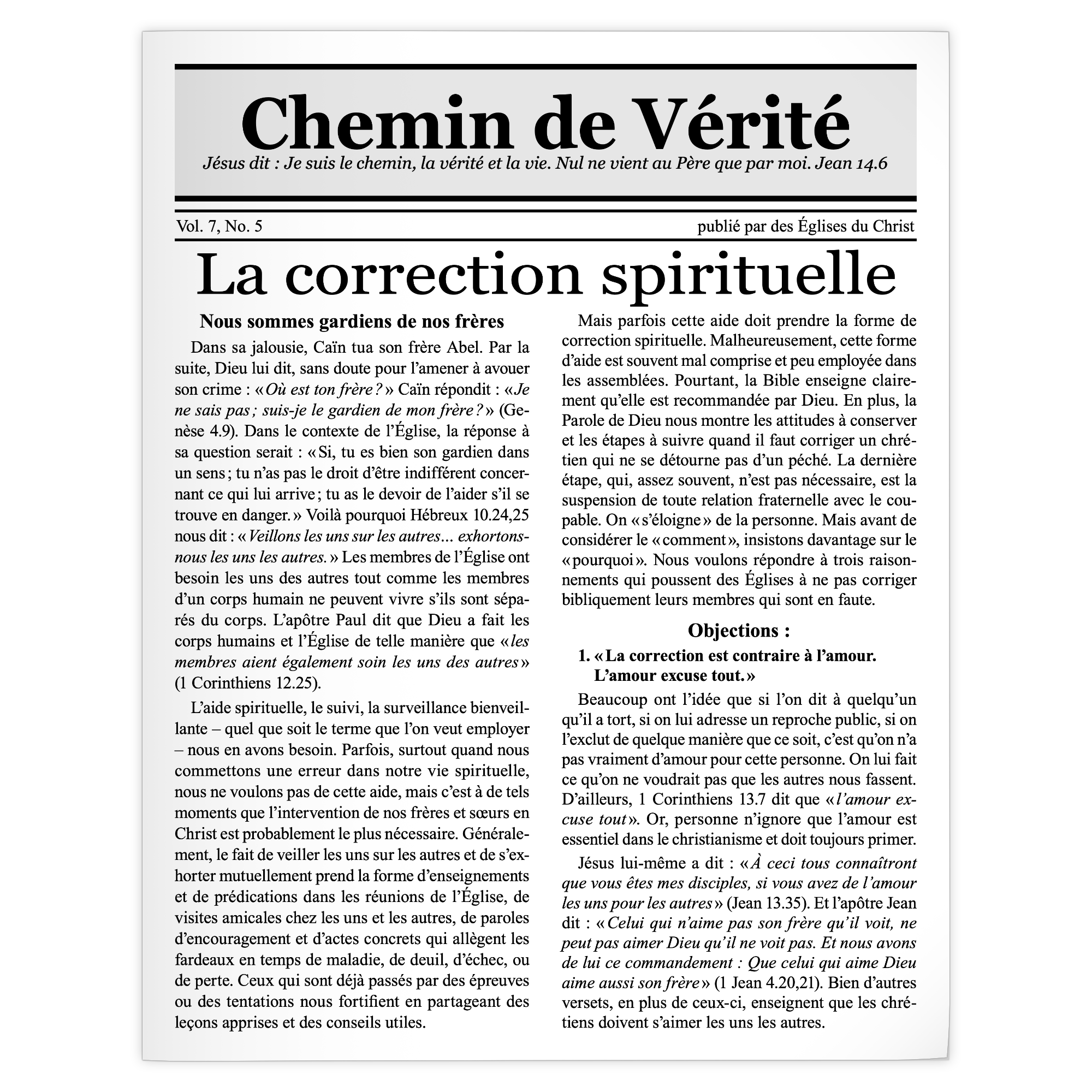 Dans sa jalousie, Caïn tua son frère Abel. Par la suite, Dieu lui dit, sans doute pour l’amener à avouer son crime : « Où est ton frère ? » Caïn répondit : « Je ne sais pas ; suis-je le gardien de mon frère ? » (Genèse 4.9). Dans le contexte de l’Église, la réponse à sa question serait : « Si, tu es bien son gardien dans un sens ; tu n’as pas le droit d’être indifférent concernant ce qui lui arrive ; tu as le devoir de l’aider s’il se trouve en danger. » Voilà pourquoi Hébreux 10.24,25 nous dit : « Veillons les uns sur les autres… exhortons-nous les uns les autres. » Les membres de l’Église ont besoin les uns des autres tout comme les membres d’un corps humain ne peuvent vivre s’ils sont séparés du corps. L’apôtre Paul dit que Dieu a fait les corps humains et l’Église de telle manière que « les membres aient également soin les uns des autres » (1 Corinthiens 12.25). […]