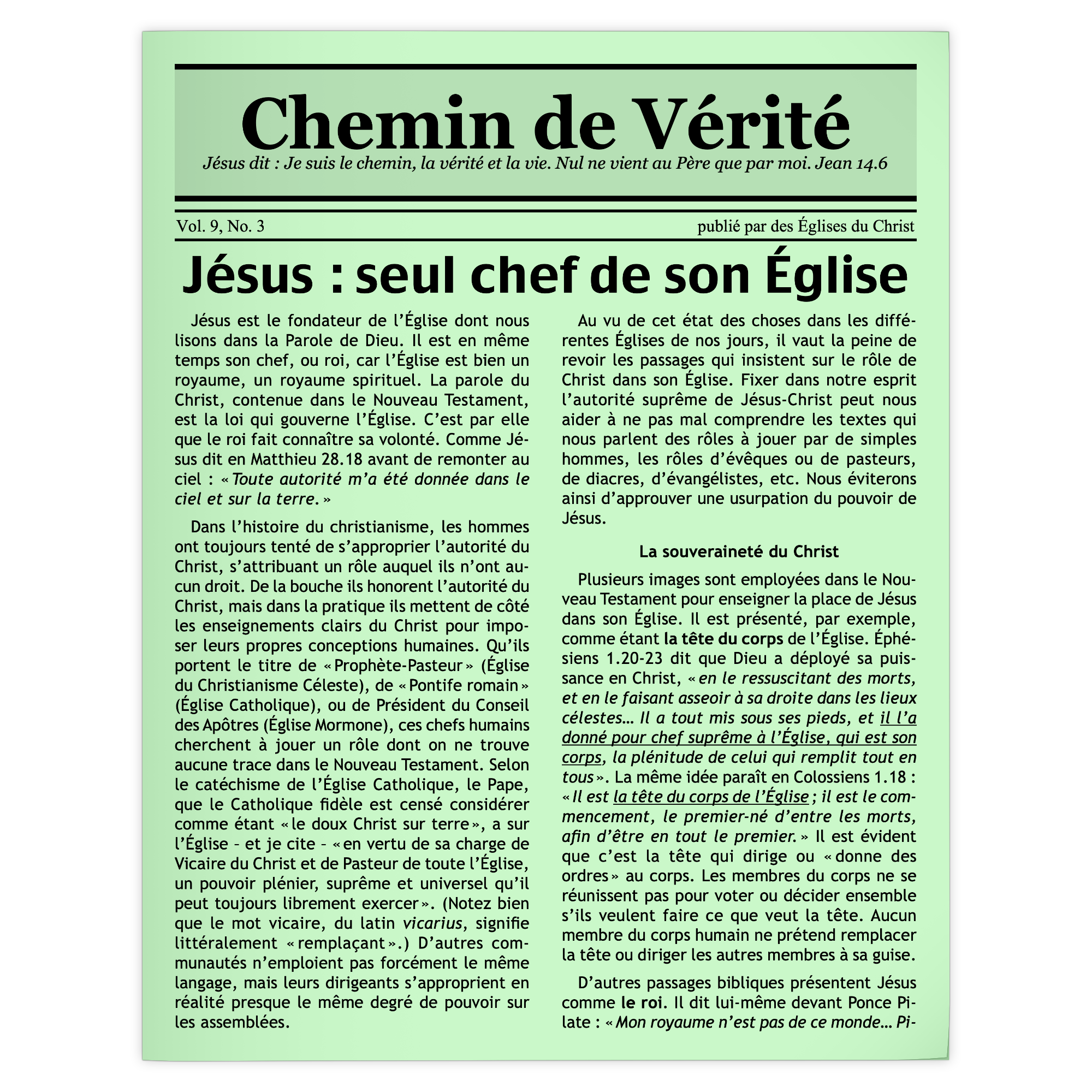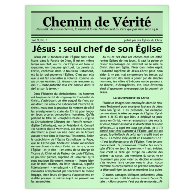 Dans l’histoire du christianisme, les hommes ont toujours tenté de s’approprier l’autorité du Christ, s’attribuant un rôle auquel ils n’ont aucun droit. De la bouche ils honorent l’autorité du Christ, mais dans la pratique ils mettent de côté les enseignements clairs du Christ pour imposer leurs propres conceptions humaines. Qu’ils portent le titre de « Prophète-Pasteur » (Église du Christianisme Céleste), de « Pontife romain » (Église Catholique), ou de Président du Conseil des Apôtres (Église Mormone), ces chefs humains cherchent à jouer un rôle dont on ne trouve aucune trace dans le Nouveau Testament. […]
