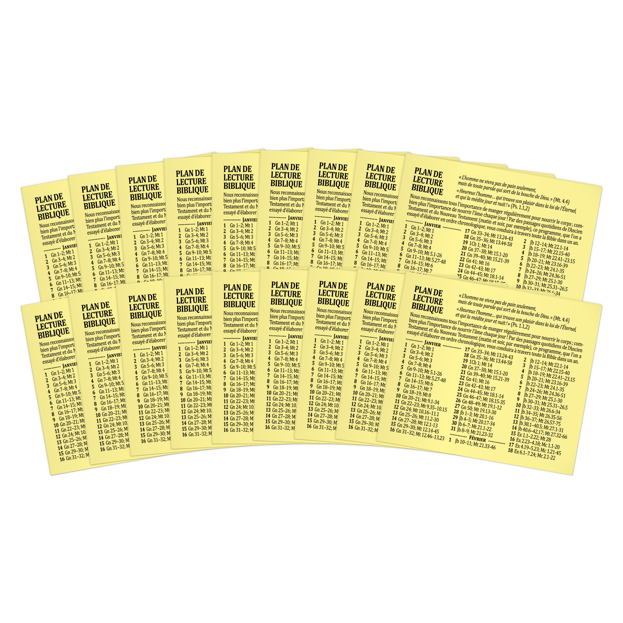 Nous reconnaissons tous l’importance de manger régulièrement pour nourrir le corps ; combien plus l’importance de nourrir l’âme chaque jour ! Par des passages quotidiens de l’Ancien Testament et du Nouveau Testament (matin et soir, par exemple), ce programme, que l’on a essayé d’élaborer en ordre chronologique, vous conduira à travers toute la Bible dans un an.